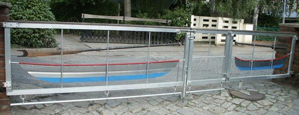 Hoftor Firma Lubkoll aus Aluminium mit Kahn- und Kanu-Applikationen aus Aluminium und Handlauf aus Holz