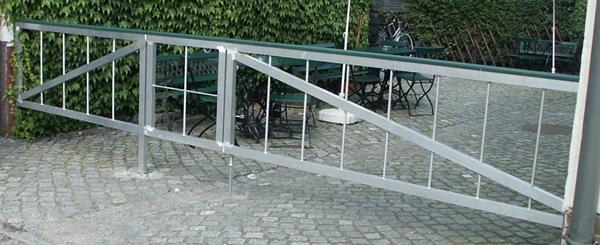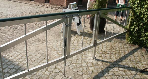 Hoftor der Brauerei Babben in Lübbenau aus Aluminium mit Handlauf aus Holz